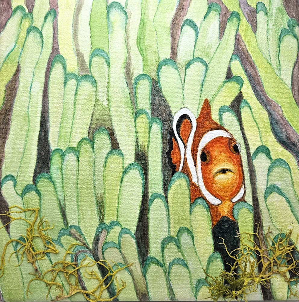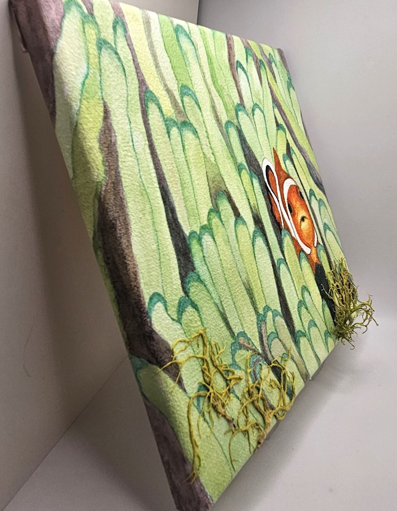 "Clownfish Among Coral" - This 8" by 8" canvas watercolor painting incorporates bright green lichen into the coral reef habitat for the hiding clownfish. This painting is versatile for desk or countertop display, as well as wall hanging from a hook on the back. Note: the painting is protected with multiple coats of Fine Art Fixative to help shield against UV damage. Obviously, hanging paintings in direct sunlight will affect color retention over time