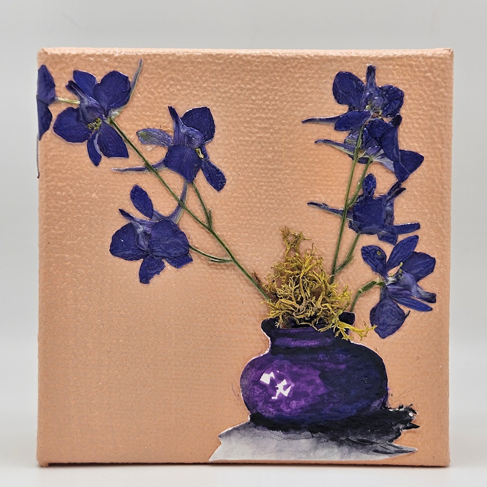 "A Dance of Larkspur: Nature Captured in a Moment" -- This unique 4" by 4" by 1.5" gallery canvas showcases a delicate 3D watercolor vase adorned with real, dried pressed Rocket Larkspur. Set against a soft acrylic background, it invites contemplation and admiration. Its compact size makes it a charming addition to any desk or countertop, while the wider 1.5-inch canvas ensures stability for proud standalone display or wall hanging.