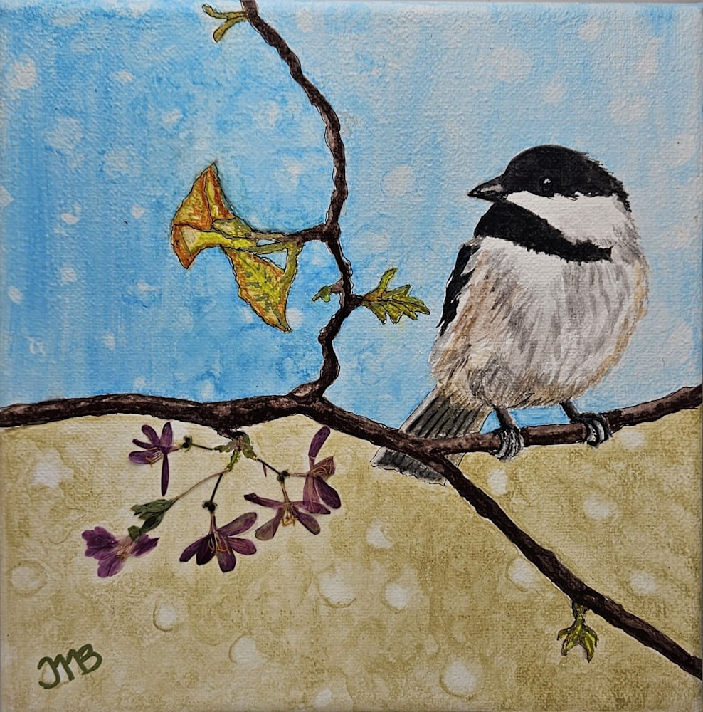 This artwork features a Black-Capped Chickadee perched on a delicate honeysuckle branch. The soft blue sky serves as a serene backdrop, inviting viewers to immerse themselves in the tranquility of nature. Each brushstroke reflects a deep appreciation for the environment, capturing the essence of springtime renewal.