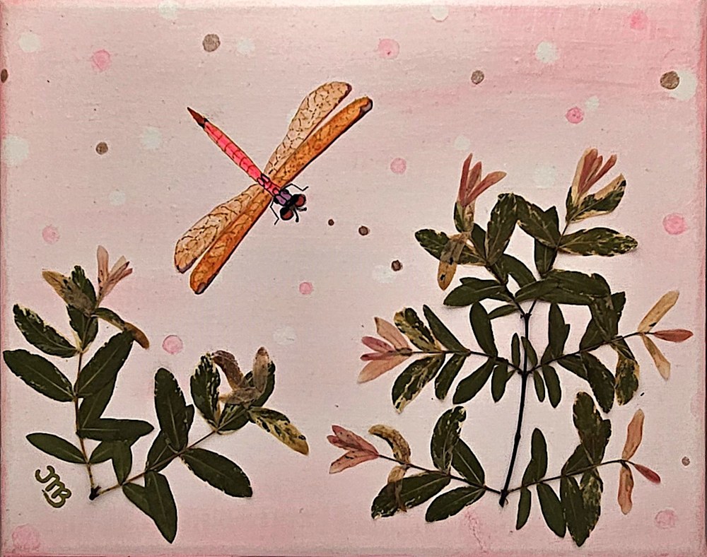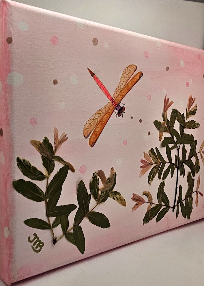 Immerse yourself in the enchanting world of "Dragonfly Daydream." This artwork captures a whimsical moment where a delicate pink dragonfly flits gracefully above a lush arrangement of pressed Dappled Willow branches. The soft pink background, adorned with playful dots, creates a dreamy atmosphere that invites reflection and joy. Each pink bud, carefully selected and preserved, tells a story of nature's beauty and resilience.