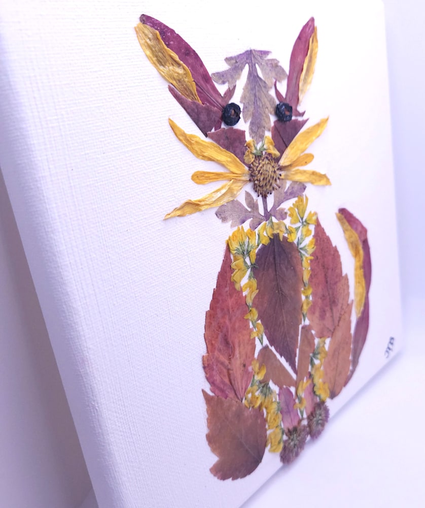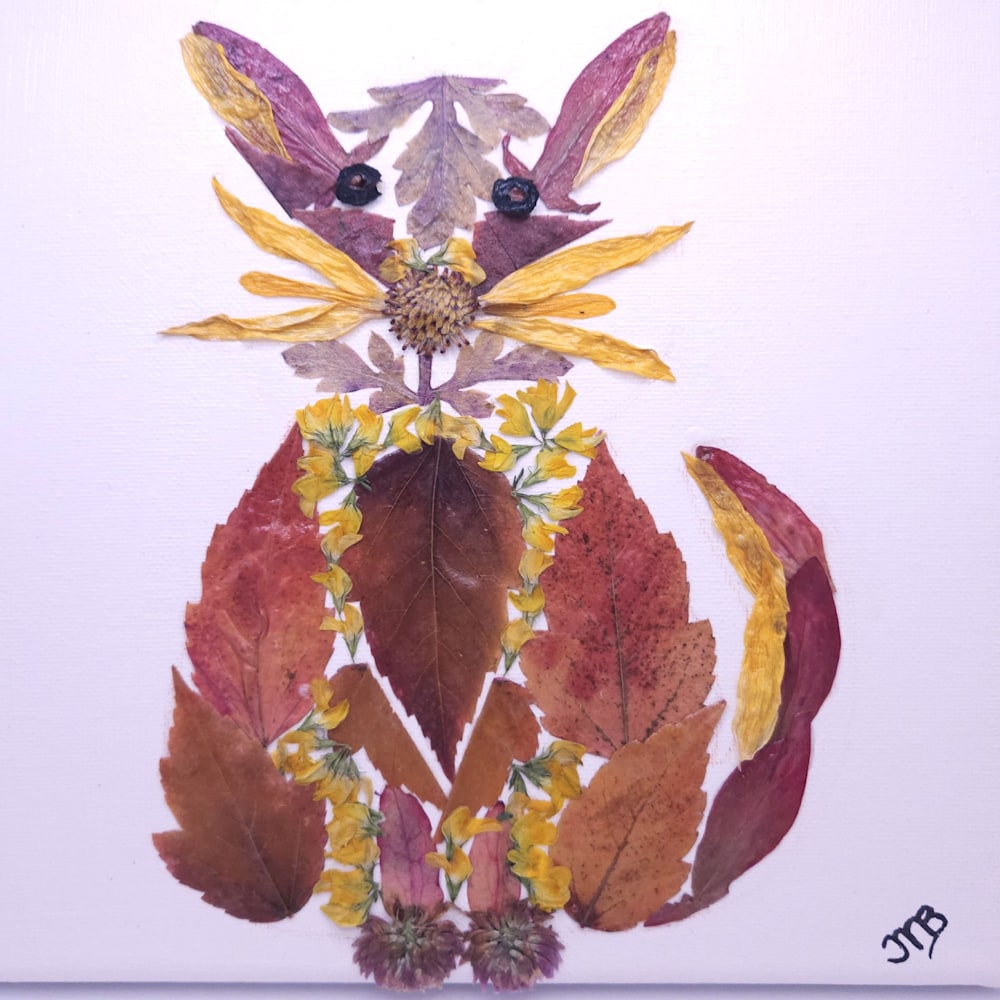 "Flowering Feline" is a whimsical creation that beautifully merges the charm of a playful cat with the vibrant hues of nature. This artwork is meticulously crafted from botanicals -- Sheep Sorrel (ears, tail), Japanese maple leaves (body), Variableleaf Collomia (mouth, forehead), Common Blanketflower (nose), Sunflower petals (whiskers, tail), Oregon Grape berries (eyes), Red Clover flowers (feet), Birdsfoot Trefoil flowers (body filler) -- showcasing the rich colors of fall. Each element is thoughtfully arranged, telling a story of serene moments spent in nature's embrace.