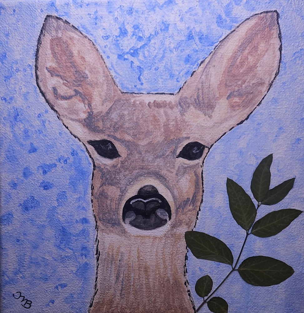 "Gentle Fawn in the Forest" presents a tender portrait of a fawn, inviting viewers to connect with its gentle spirit. The soft blue background creates a serene atmosphere, while the real pressed botanical element adds a unique touch of nature. This piece reflects the artist's journey, merging traditional techniques with contemporary styles, and embodies a moment of tranquility in the wild.