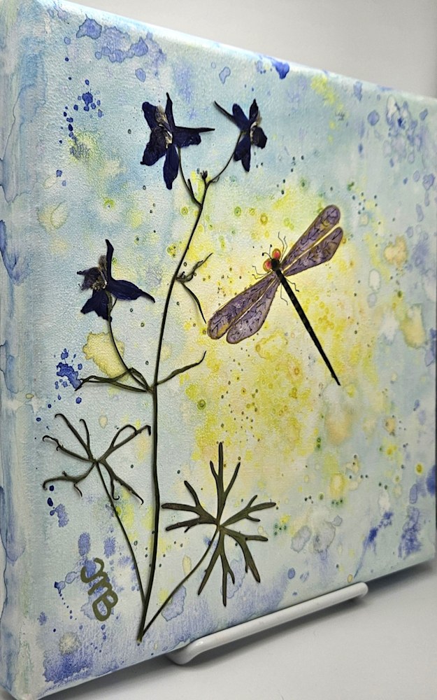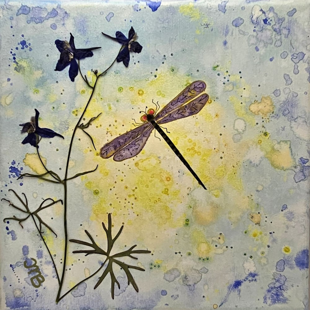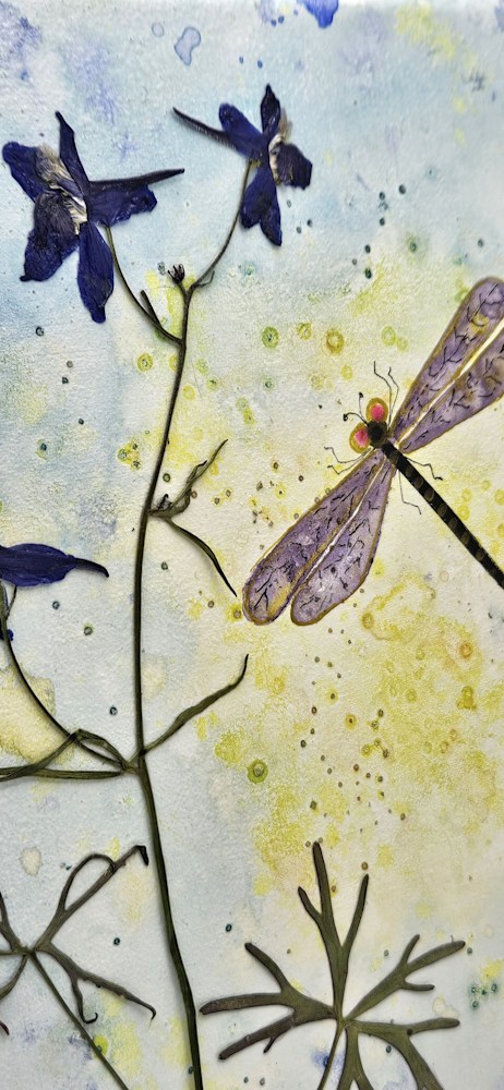 This artwork embodies a deep connection to nature, celebrating the intricate details that often go unnoticed. Each brushstroke tells a story of exploration, reminiscent of quiet moments spent in the embrace of the natural world. The dragonfly symbolizes transformation, while the larkspur adds a touch of elegance.