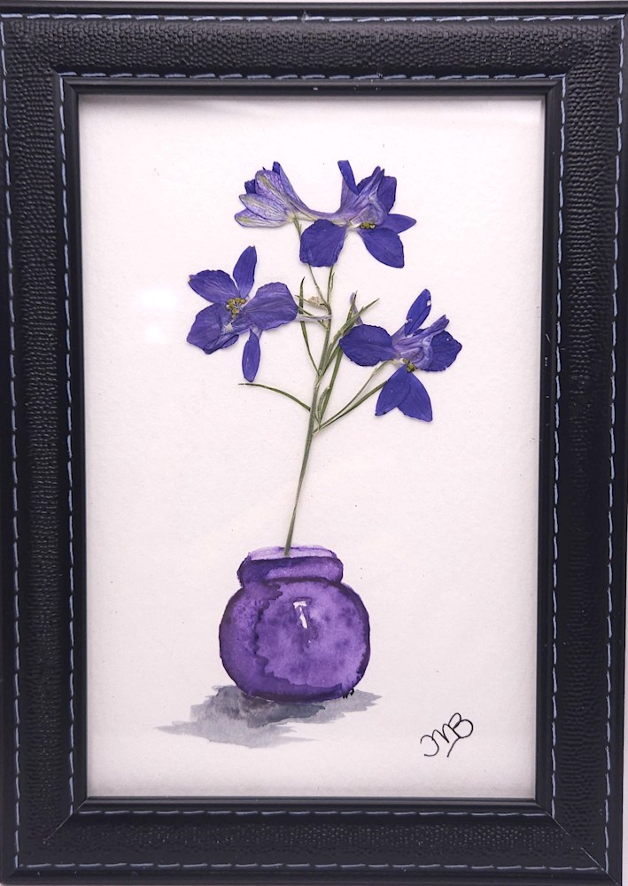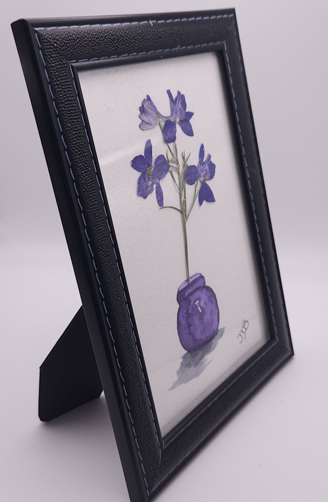 "Purple Vase" -- This 3.75" x 5.75" (painting), 5" x 7" (exterior measurements of frame) black-framed watercolor painting on watercolor paper incorporates dried flowers and leaves -- Rocket Larkspur -- in a round purple vase. These miniature paintings are perfect for desk or countertop display (frame has its own stand) or as a wall hanging.